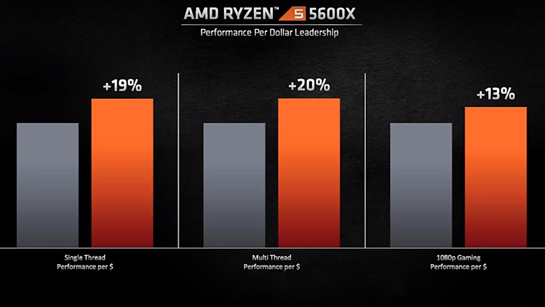 일반 사람들이 가장 많이 사용하는 중간급 cpu 라이젠 5600x는 코어 6개, 스레드 12개, 부스트 클럭 4.6GHz 입니다. 이것도 역시 달러당으로 인텔 i5-10600k와 비교했는데요. 싱글 코어 19%, 멀티성능은 20% 차이가 나더라고요. 그리고 게임에서도 13% 더 높다고 합니다.