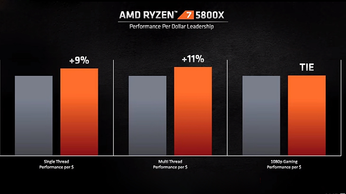하이엔드급과 중간급인 라이젠 5800x는 코어 8개, 스레드 16개, 부스트 클럭 4.7GHz 입니다. 비교는 한 가지 방식인 달러당으로 했습니다. 인텔 i7-10700k 비해서 싱글 코어 성능 9%, 멀티는 11%, 게임 부분에서는 거의 비슷하게 나왔습니다.